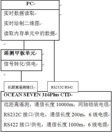 CTD可直接通過RS232C接口與電腦相連,RS422接口的有效通訊距離比RS232C接口長。當使用長距離遙測時,需要一個甲板單元,將來自PC的RS232C通信端口的信號轉成遙測信號,信號和供電也必須通過同軸鎧裝電纜傳輸。
