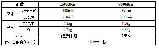 直徑75mm,長315mm,耐壓1500m;直徑66mm,長315mm,耐壓7000m。