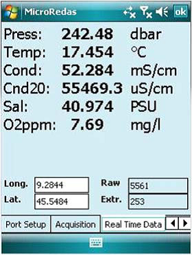 便攜式數(shù)據(jù)讀取裝置通過內(nèi)置的RS232C接口與OCEAN SEVEN 3XX CTD連接,并且專門開發(fā)了用于Windows Mobile?操作系統(tǒng)的軟件:ZTERM和μREDAS。這些軟件允許使用者直接對CTD進行各種操作,如傳感器校準,實時數(shù)據(jù)采集,配置等。